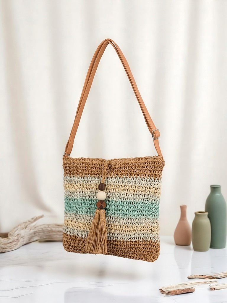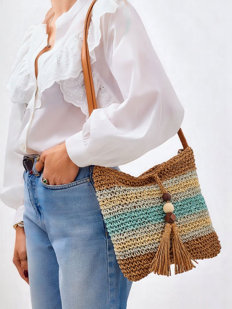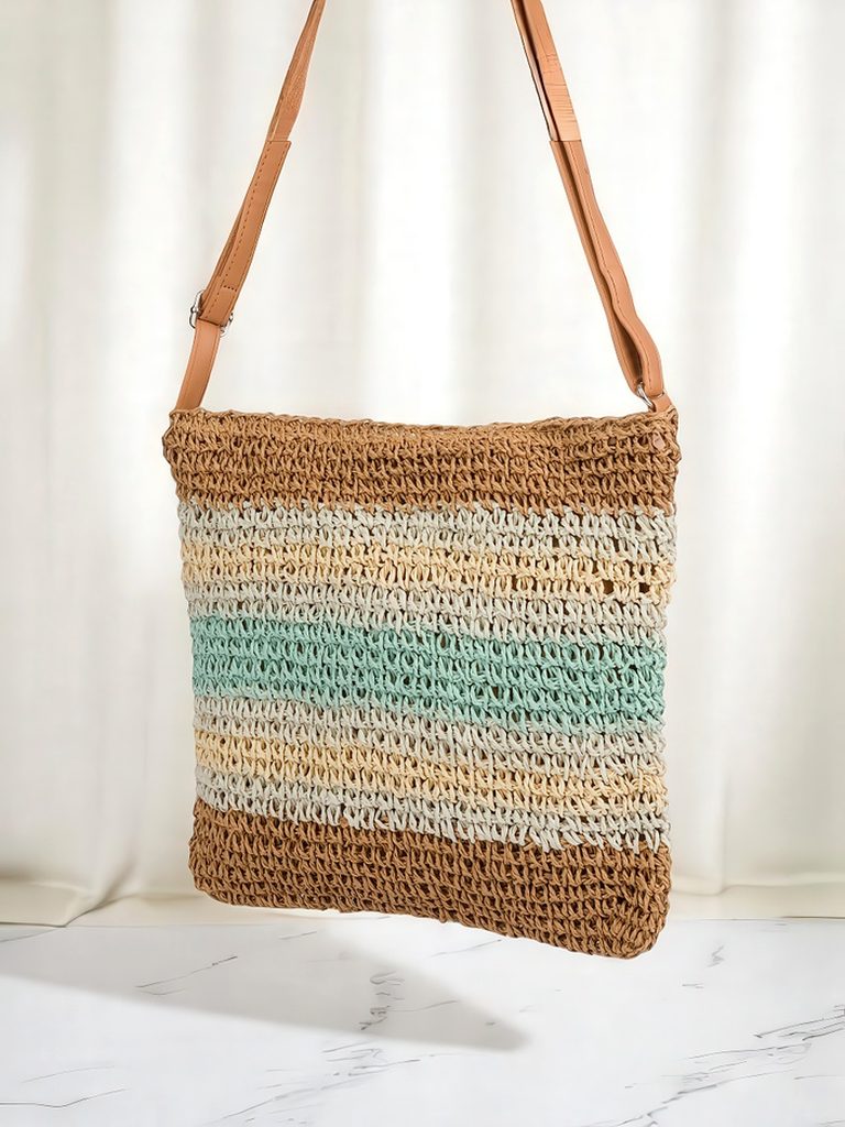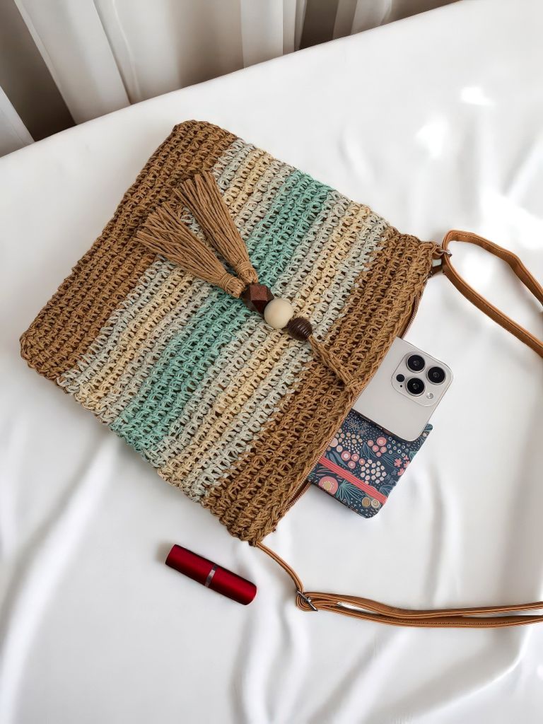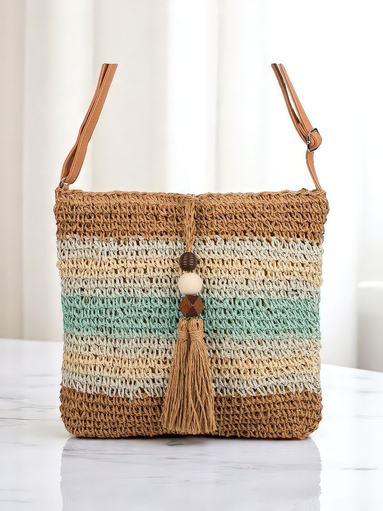 - Un petit sac à main en paille tressée avec un motif rayé et un porte-clés décoratif. Il comporte un compartiment, une poche et une fermeture éclair. Élégant et léger, il est parfait pour l'été et les balades !
