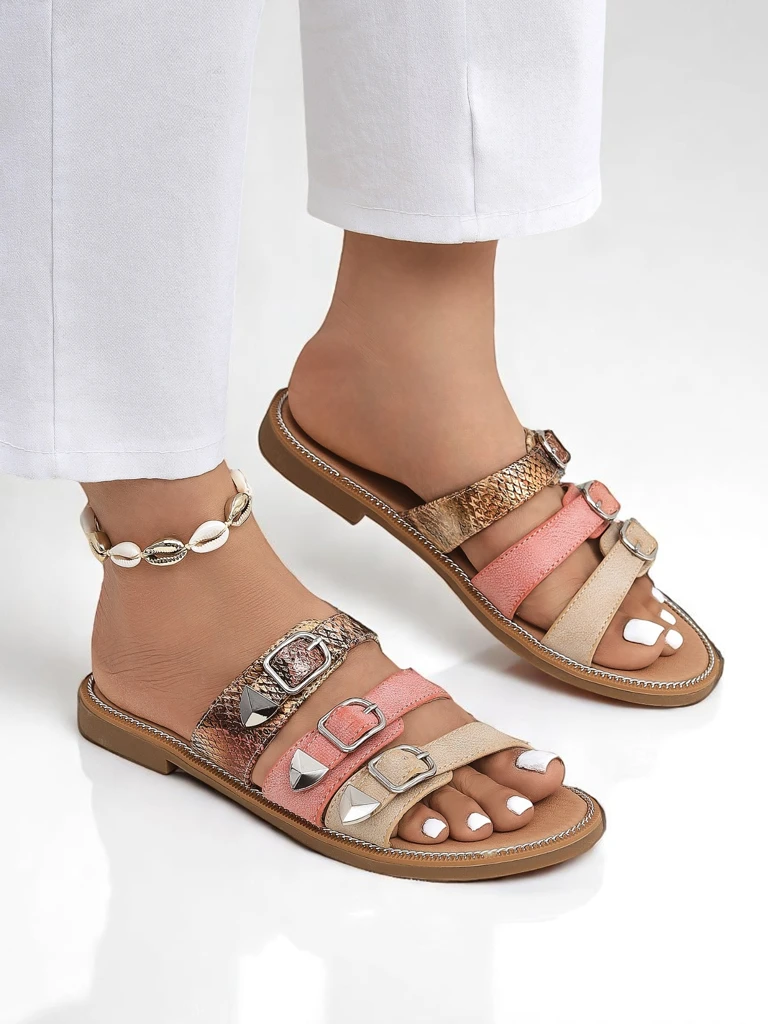 • Sandales plates en cuir écologique avec gaufrage et boucles décoratives. Élégantes et confortables, parfaites pour l'été, la ville et les tenues de tous les jours !