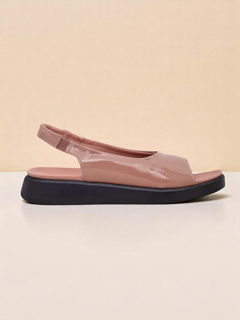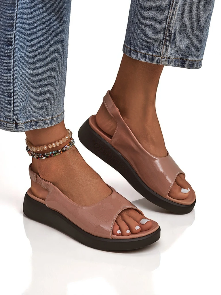 - Sandales élégantes à semelle épaisse en cuir écologique brillant. Le modèle à enfiler allie confort et look moderne, parfait pour les journées et soirées d'été.