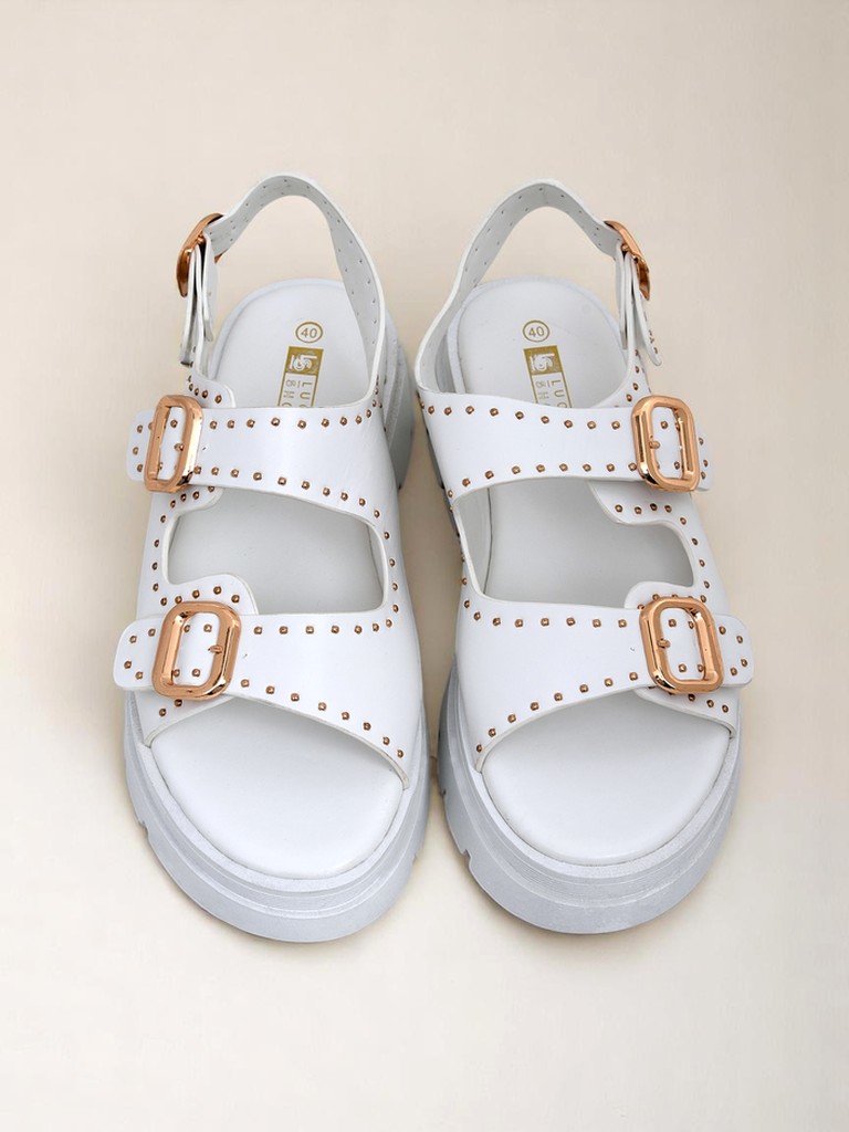 - Sandales pour femmes en cuir écologique avec une semelle épaisse, ornées de strass brillants. Fermées par une boucle, elles allient confort et style moderne et expressif.