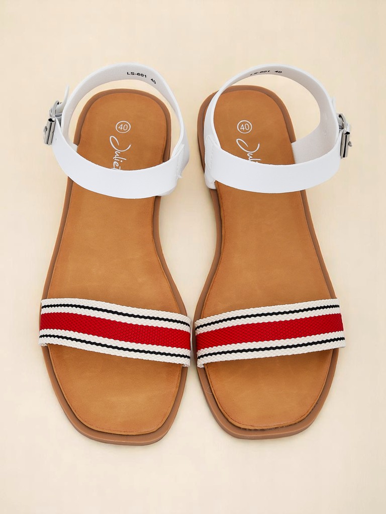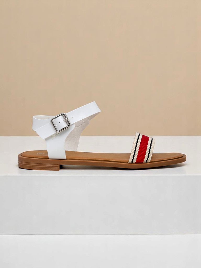 - Sandales plates élégantes en cuir écologique doux. La bride en tissu ajoute de la légèreté et la boucle assure un ajustement confortable au quotidien.
