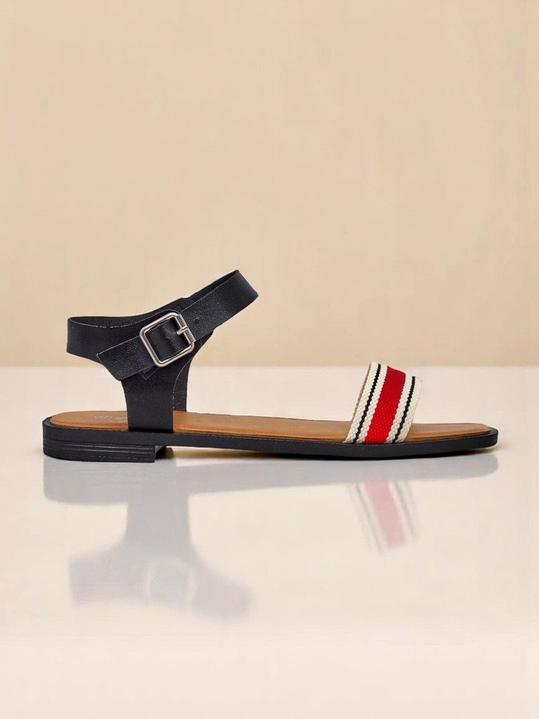- Sandales plates élégantes en cuir écologique doux. La bride en tissu ajoute de la légèreté et la boucle assure un ajustement confortable au quotidien.