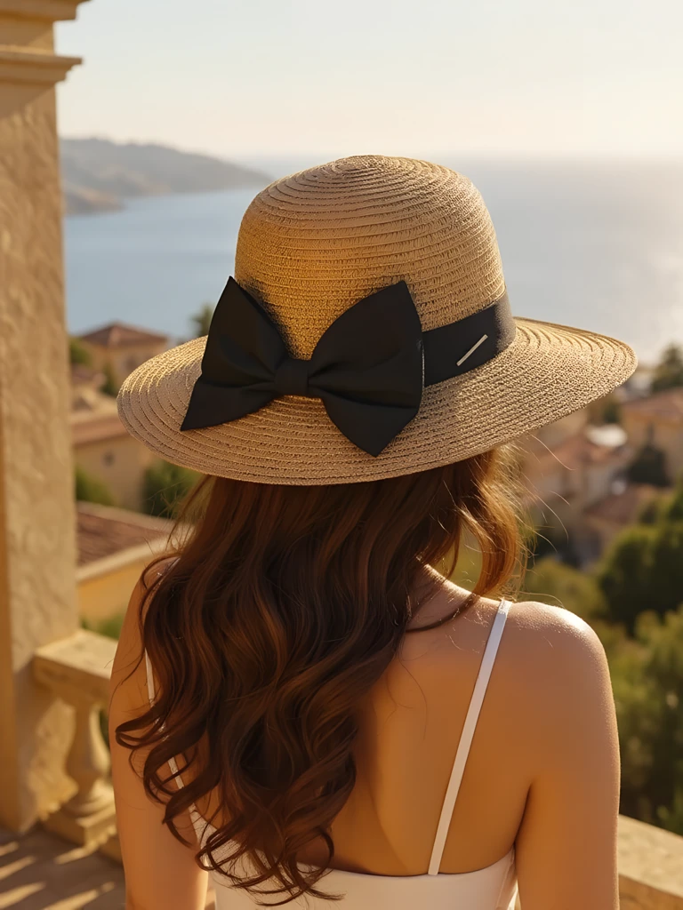 • Chapeau de paille pour femme avec large bord et ruban accrocheur orné d’un grand nœud. Élégant, léger et aéré — idéal pour l’été, la plage et des tenues élégantes et féminines !