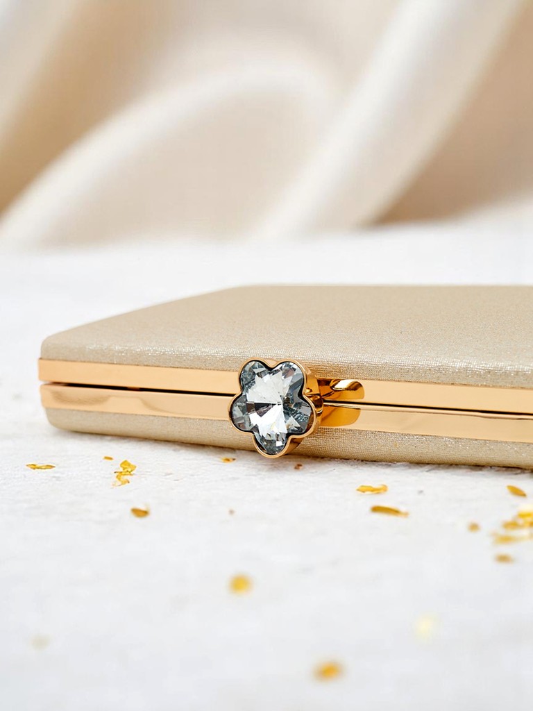 - Pochette élégante en cuir écologique, recouverte d'un tissu avec un fil brillant et un gaufrage délicat. Fermeture à pression, avec une chaîne amovible — brillez en toute occasion.