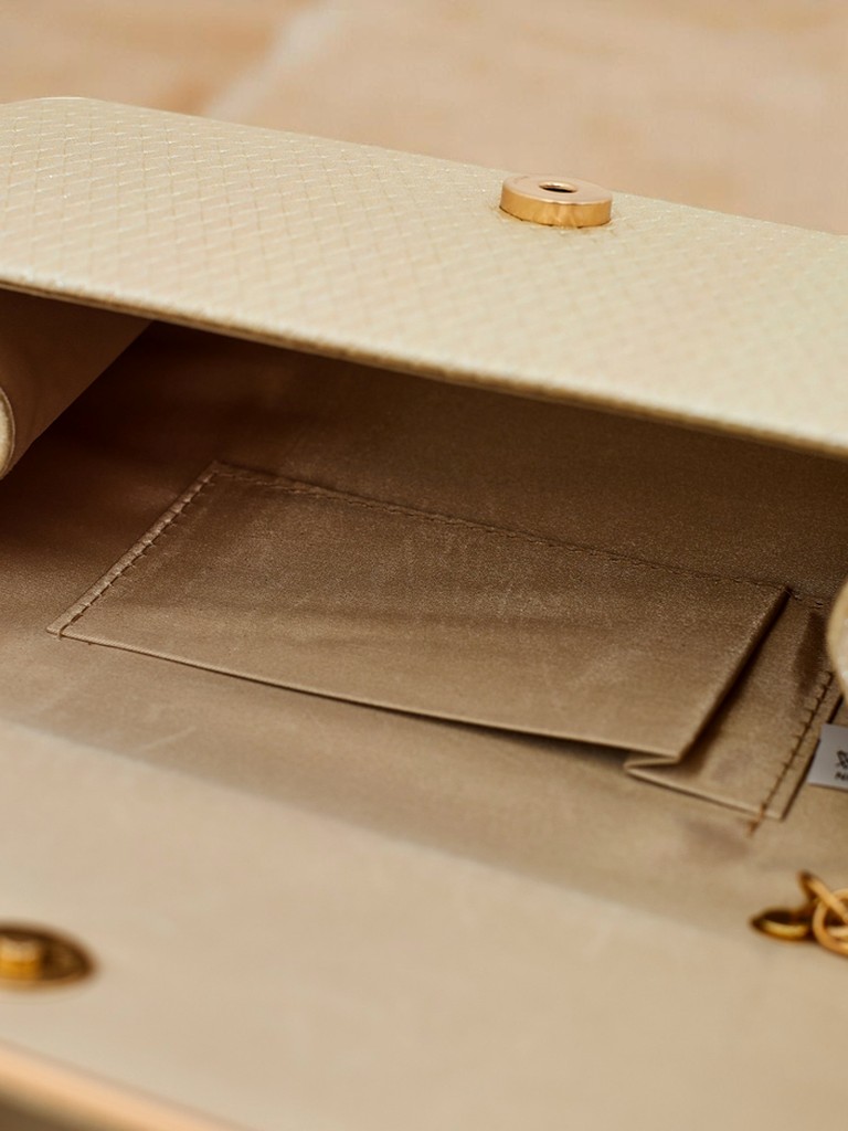 - Pochette en cuir écologique, recouverte d’un tissu à fil scintillant et à délicats motifs embossés. Fermeture aimantée, avec une bandoulière amovible – parfaite pour les sorties en soirée.