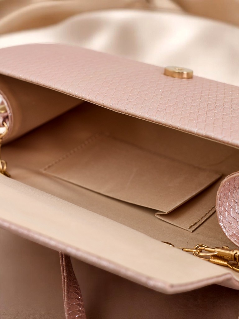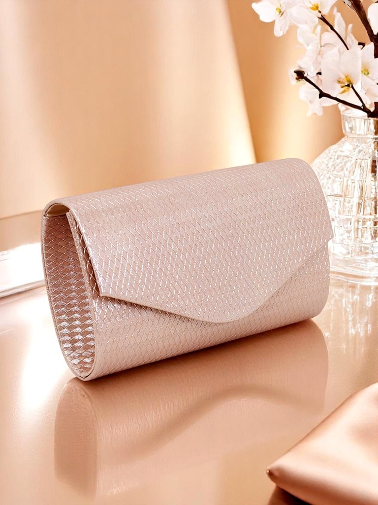 - Pochette enveloppe en cuir écologique, recouverte de tissu avec un fil scintillant et un gaufrage subtil. Fermeture magnétique, avec une bandoulière amovible – l’élégance dans une version brillante.