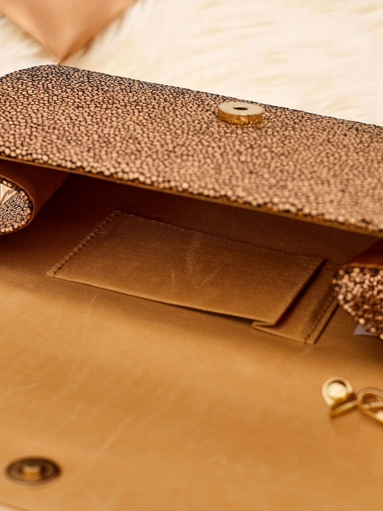 - Pochette élégante en cuir écologique, recouverte d’un tissu pailleté épais. Fermeture magnétique, avec une bandoulière amovible – parfaite pour les sorties en soirée et les occasions spéciales.