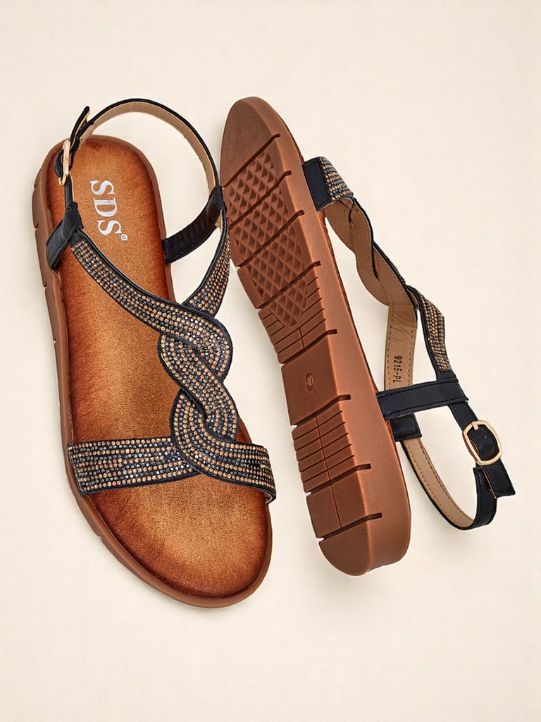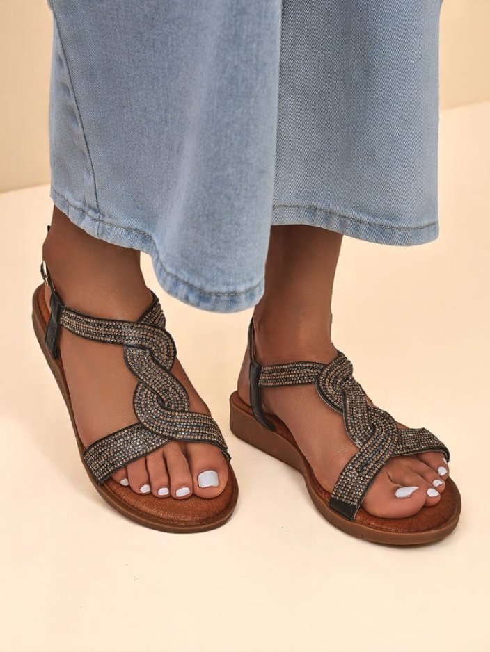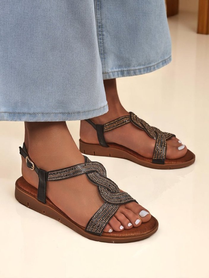 • Sandales plates pour femmes en cuir écologique, ornées de strass. Légères, confortables et élégantes – parfaites pour l'été, les sorties quotidiennes et les soirées estivales avec une touche d'éclat.