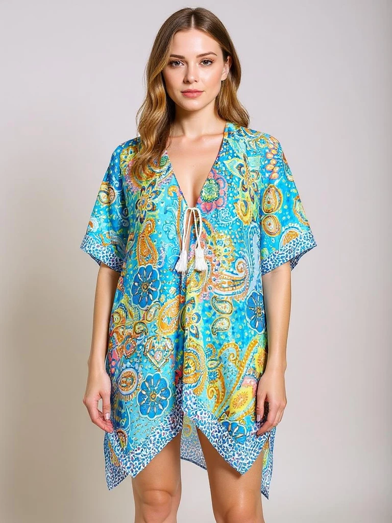 - Cette tunique de plage de type paréo avec un col en V et un ourlet asymétrique est un incontournable élégant pour les vacances. Le tissu léger et vaporeux et le motif accrocheur soulignent la féminité, tandis que la coupe ample assure le confort pendant l
