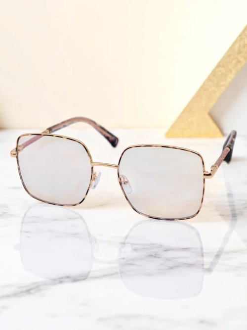 • Lunettes de soleil élégantes avec des verres carrés et sans monture. Disponibles en différentes couleurs. Les détails dorés et les branches légères offrent un look tendance et un port confortable.