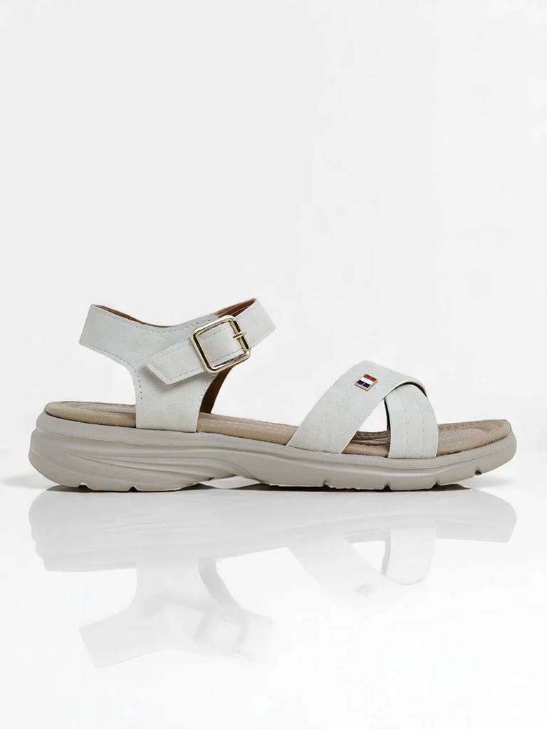 - Sandales plates pour femmes en cuir écologique mat, fermées par une boucle. Elles sont dotées d'une semelle intérieure souple et respirante qui assure un confort de port tout au long de la journée. Légères, élégantes et parfaites pour les promenades estiv