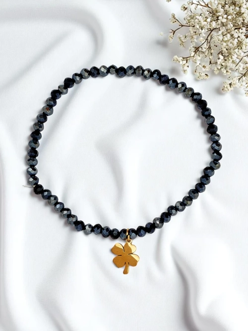 - Bracelet avec perles et breloque trèfle, un talisman porte-bonheur stylé. Fin et élégant, il symbolise la chance, l’espoir et l’énergie positive. Parfait pour un usage quotidien, comme accessoire discret porteur d’un message unique.