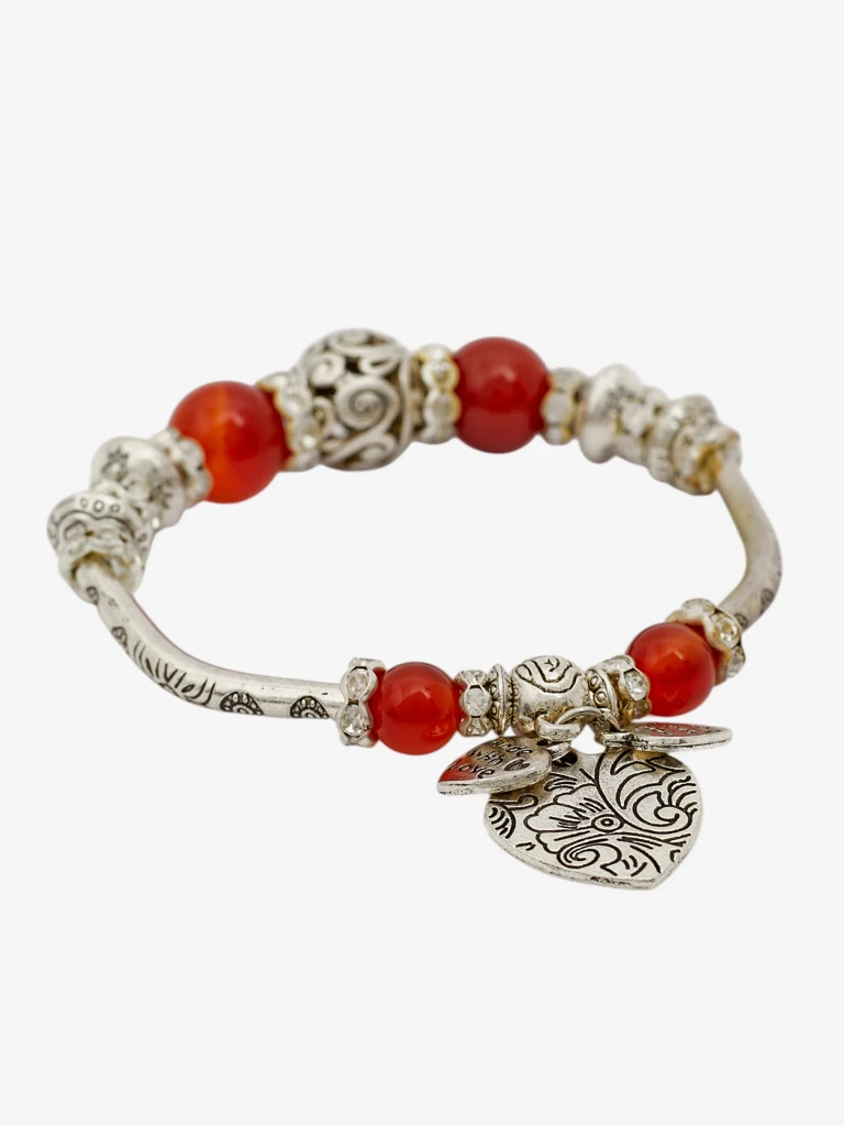 - Un bracelet féminin sur un élastique, orné de cristaux, de perles et de pierres en zircon cubique. Des breloques en forme de cœur ajoutent du charme au bracelet. Léger, confortable et plein d’éclat – parfait comme cadeau ou pour une tenue romantique.