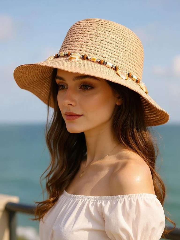 - Chapeau pour femme en paille naturelle, décoré de coquillages, parfait pour les journées d’été. Léger, respirant, il offre une protection solaire et ajoute une touche tropicale et balnéaire à toutes les tenues. Idéal pour la plage, les vacances ou une fêt
