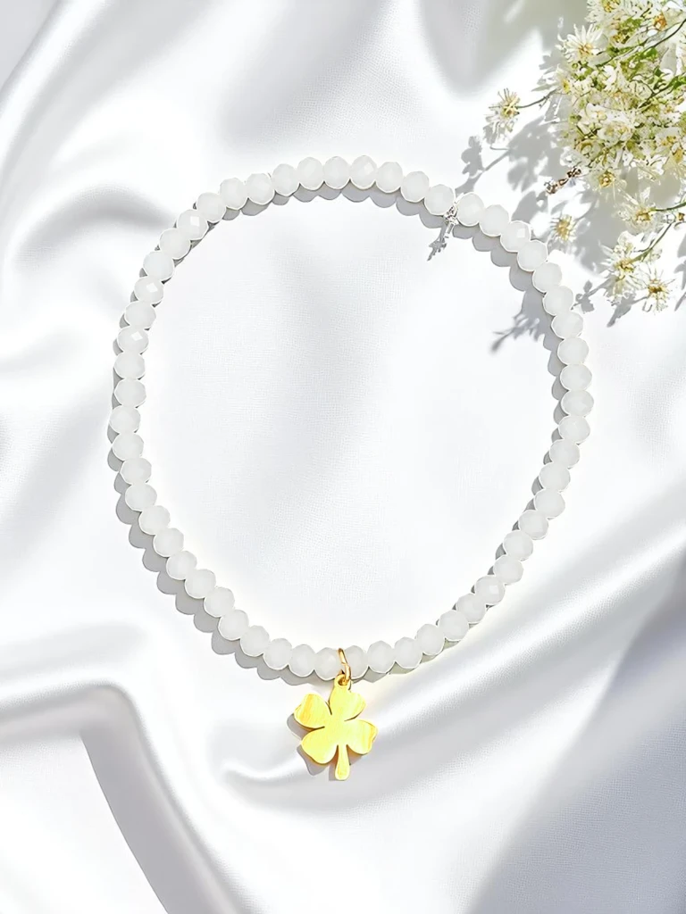 • Bracelet avec perles et pendentif trèfle, un talisman porte-bonheur tendance. Délicat et élégant, il symbolise la prospérité, l’espoir et l’énergie positive. Parfait pour un port quotidien comme accessoire subtil au message unique.