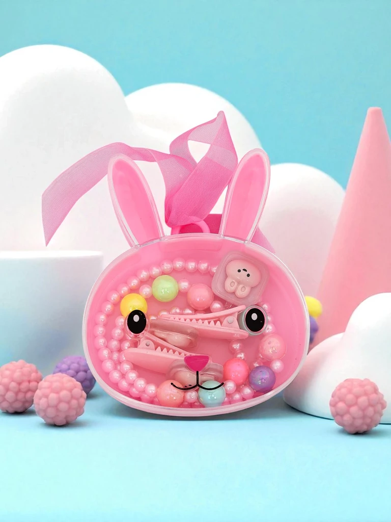 L'ensemble de bijoux Bambina Dolce est un ensemble unique créé spécialement pour les petites passionnées de mode, inspiré par la délicatesse italienne et la joie féerique de l'enfance. L'ensemble comprend un sac à main rose en forme de lapin avec un nœud adorable, un collier et un bracelet de perles colorées, ainsi que deux clips ornés d'un motif de fille. Tous les éléments sont fabriqués en plastique ABS de haute qualité et en silicone non toxique, possédant les certifications de sécurité CE destinées aux produits pour enfants. Les finitions sont lisses, exemptes de substances nocives, protégeant la peau sensible de l'enfant contre les irritations. L'ensemble ne contient pas de petits éléments facilement détachables, ce qui le rend idéal même pour les jeunes enfants. Le collier et le bracelet sont dotés d'un fil élastique et extensible, ce qui les rend faciles à mettre et à enlever sans risque de rupture. Les clips ont une fermeture légère et anti-pression qui n'irrite pas les oreilles. Bambina Dolce séduit non seulement par son apparence, mais aussi par sa fonctionnalité : le sac à main est idéal pour ranger de petits objets ou comme mini-porte-monnaie. Les perles colorées ajouteront à chaque style un caractère enfantin et joyeux. Le design adorable fait référence aux tendances actuelles « kawaii » et aux accents pastel, qui sont très à la mode chez les plus jeunes. Comment porter Bambina Dolce ? 1. Au quotidien, avec une jupe en tulle, un chemisier clair et des ballerines – l'ensemble soulignera un look féerique, idéal pour une aire de jeux ou une promenade. 2. Pour une fête d'anniversaire, associez-le à une robe chic aux couleurs pastel pour ajouter de la grâce et de l'élégance enfantine. 3. Pour les fêtes de famille, associez-le à un simple jean et un t-shirt – les accessoires colorés égayeront n'importe quelle tenue. Nettoyez l'ensemble uniquement avec un chiffon humide – évitez les détergents puissants. Rangez le sac à main et les bijoux dans un endroit sec, à l'abri des sources de chaleur. Il est recommandé d'enlever les clips la nuit. Bambina Dolce est une idée cadeau idéale – elle développe la créativité et le sens de l'esthétique, tout en s'inscrivant dans les tendances de la mode actuelle pour les enfants.