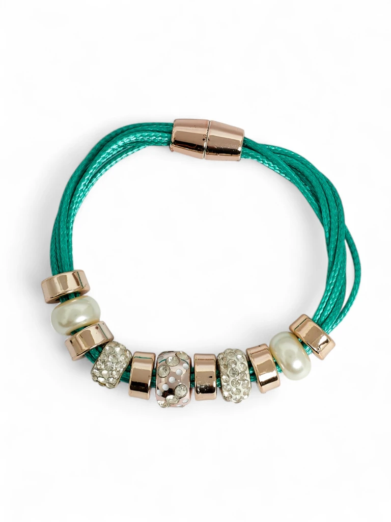 • Élégant bracelet pour femmes sur cordons avec fermoir magnétique. Orné de perles argentées avec des zircons qui brillent magnifiquement à la lumière. Un accessoire élégant pour les styles de tous les jours et de soirée.