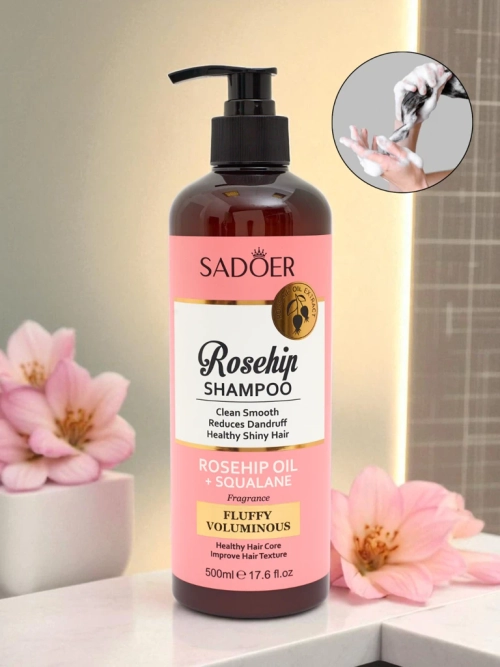 - Shampooing à l'huile de rose sauvage et au squalane – hydrate, donne du volume, réduit les pellicules.