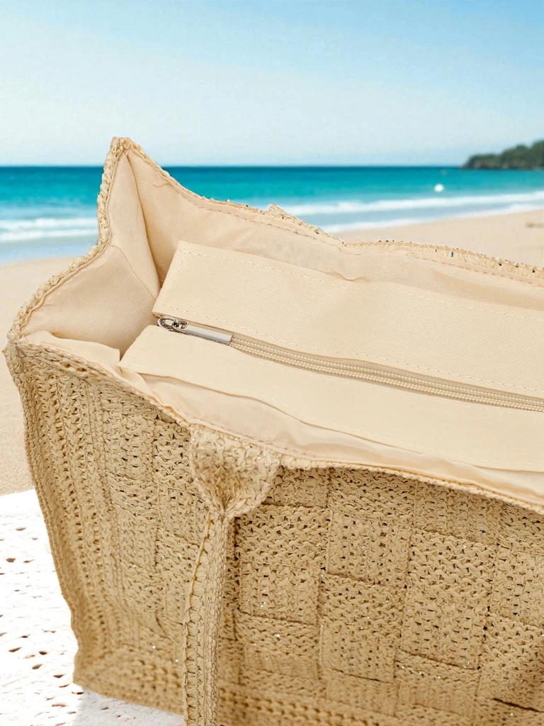 • Élégant sac à main en paille avec un compartiment et une poche, fermé par une fermeture éclair. Léger et spacieux, parfait pour les journées d’été. Idéal pour des tenues décontractées, il offre confort et organisation tout en conservant un charme mode.