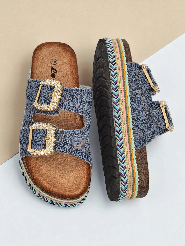 - Mules à plateforme élégantes avec une semelle aspect liège, dotées de brides en tissu tressé ornées de boucles à strass. Une semelle intérieure confortable en éco-daim assure le confort, tandis que les détails brillants ajoutent de l'élégance aux tenues d