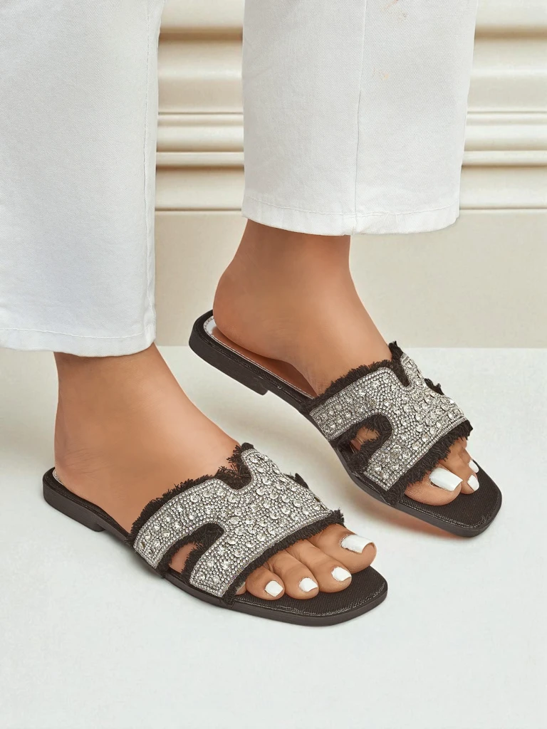 • Mules plates pour femme en éco-cuir, ornées de strass scintillants. Élégantes et confortables, parfaites pour l'été et les occasions spéciales. Elles apportent de l’éclat à toutes les tenues tout en assurant un confort tout au long de la journée.