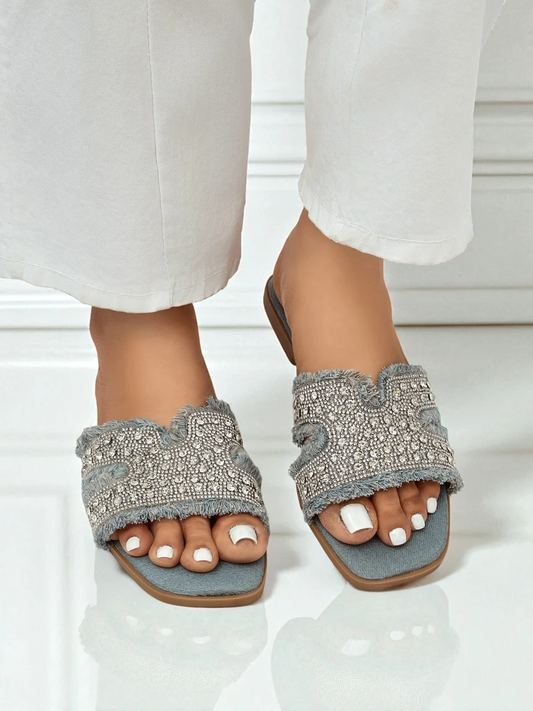 - Sandales plates pour femmes en éco-cuir, décorées de strass étincelants. Élégantes et confortables, parfaites pour l'été et les occasions spéciales. Elles ajoutent de l'éclat à toutes les tenues tout en offrant un confort toute la journée.