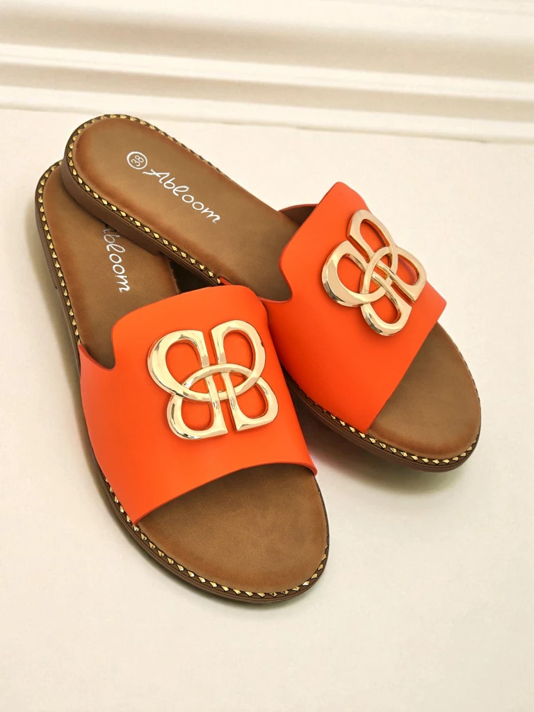- Sandales plates pour femmes en cuir écologique, ornées d'une applique élégante sur le dessus. Parfaites pour les journées chaudes – légères, confortables et à la mode. Idéales pour les tenues d'été, aussi bien pour le quotidien que pour les occasions spéc