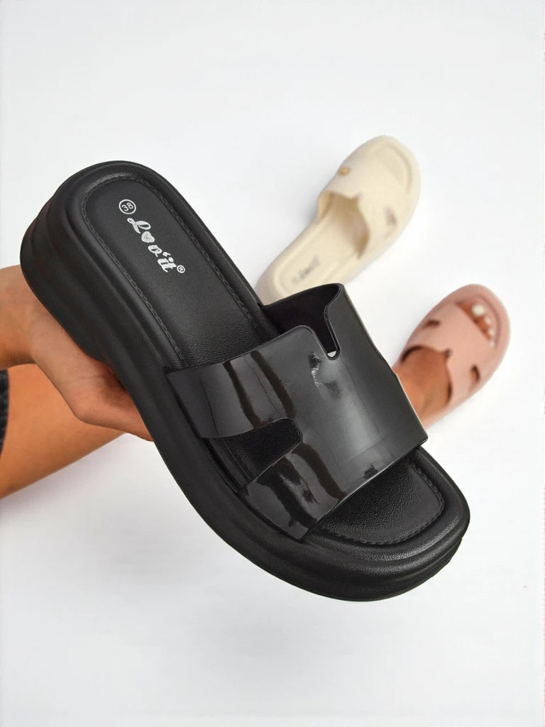 • Sandales pour femmes à semelle épaisse, avec une semelle intérieure en cuir écologique et une bride en caoutchouc verni. Style moderne et confort en un - parfaites pour les styles estivaux et urbains.