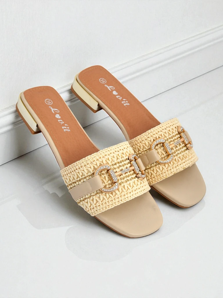 - Sandales plates pour femmes avec semelle intérieure en cuir écologique, bride tressée en tissu et ornement doré. Élégantes et confortables, parfaites pour l'été et les tenues décontractées de tous les jours.