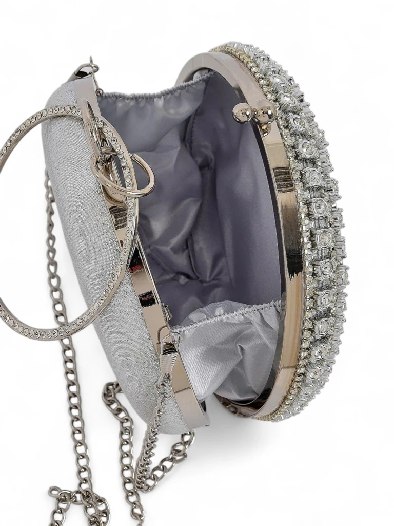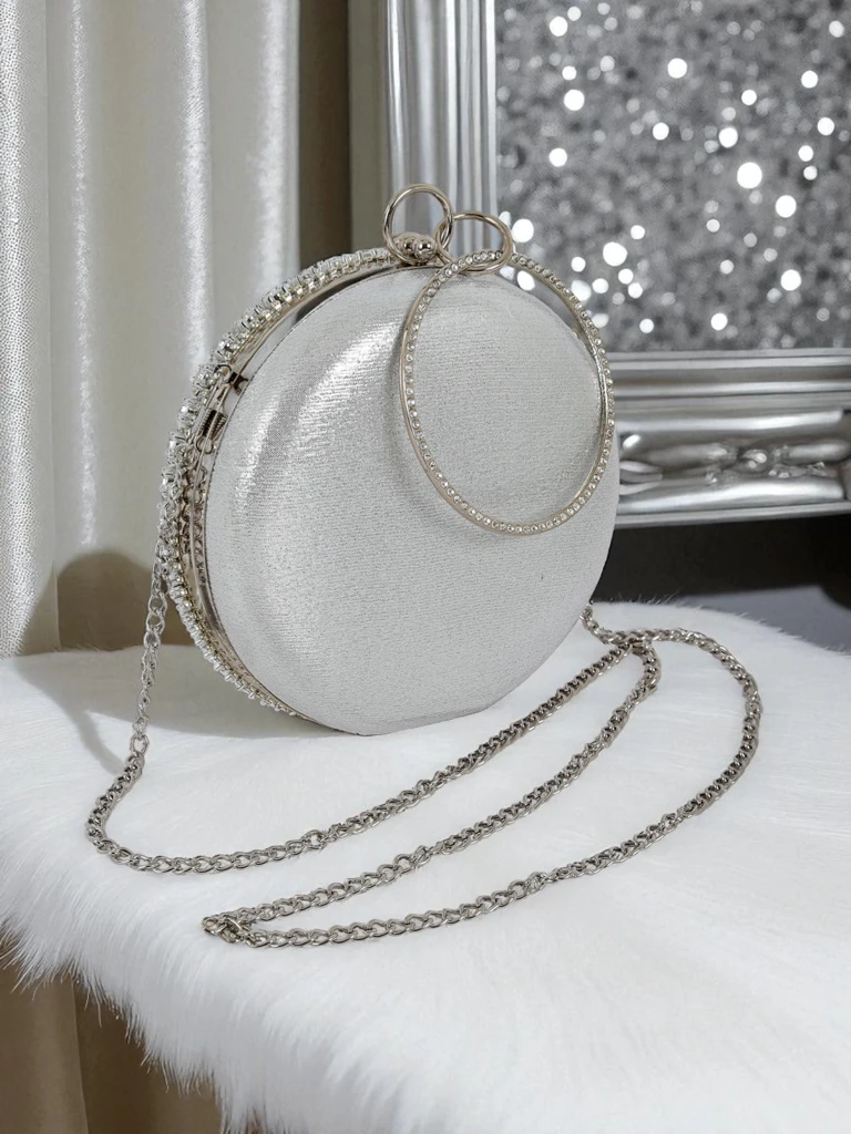 - Pochette ronde avec une surface ornée de manière complexe de zircons. Une chaîne permet de la porter à l'épaule. Élégante, expressive et créée pour briller après la tombée de la nuit.