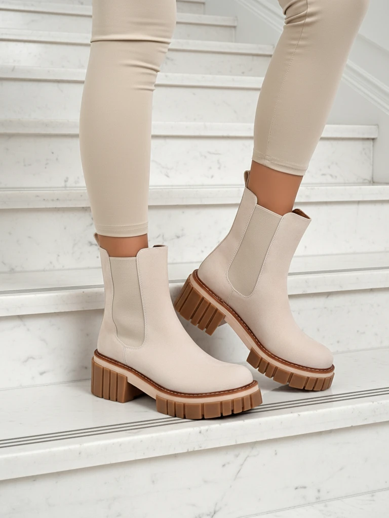Les bottines beiges Callista sont une combinaison exceptionnelle de classique et de moderne dans une version féminine. Fabriquées en cuir écologique suédé de haute qualité, elles offrent durabilité et un matériau agréable au toucher qui imite parfaitement le daim naturel, tout en étant facile à entretenir et respectueux de l'environnement. Le processus de production de ce cuir consiste en un traitement minutieux des microfibres, donnant un effet de finition mate profonde et assurant une résistance même en cas d'utilisation quotidienne. De plus, le matériau possède un certificat de qualité OEKO-TEX, confirmant l'absence de substances nocives.Les bottines Callista sont déclinées dans une teinte beige clair tendance. Le talon bloc leur confère un caractère moderne, tout en garantissant stabilité et confort lors de la marche, et le bout rond assure un confort même tout au long de la journée. La doublure douce et les inserts latéraux élastiques rendent les chaussures faciles à enfiler et s'adaptent parfaitement à la forme du pied.Principaux avantages :- Confort exceptionnel grâce au talon bloc stable,- Design universel – convient aussi bien aux styles décontractés qu'aux tenues plus élégantes,- Résistance à la saleté et facilité de nettoyage (une brosse douce ou un chiffon humide suffisent),- Matériau écologique protégeant l'environnement.Idées de tenues :1. Pour un look urbain quotidien, portez-les avec un jean ajusté, une chemise blanche et un manteau ample,2. Pour un rendez-vous ou une soirée, associez les bottines à une robe midi évasée et un long cardigan,3. Découvrez l'élégance en les associant à un tailleur de couleur neutre – une touche moderne pour les tenues de bureau !Entretien et rangement :Nettoyez les bottines avec une brosse douce pour daim ou un chiffon humide sans détergents. Protégez-les de l'humidité et de l'ensoleillement intense – il est préférable de les ranger dans un endroit aéré sur les semelles intérieures d'origine ou dans une boîte.Actuellement, les semelles massives et les talons blocs expressifs sont l'une des tendances automnales les plus importantes, et la couleur beige classique fait de ces bottines une proposition universelle pour toute femme qui apprécie le confort, le style et les tendances de la mode actuelles.
