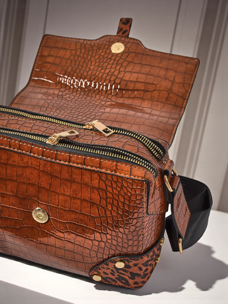 - Sac ".légant en cuir écologique verni avec gaufrage et inserts panthère. 2 compartiments pour une meilleure organisation et une bandoulière amovible et réglable. Une combinaison audacieuse d'élégance et d'une touche de caractère sauvage.