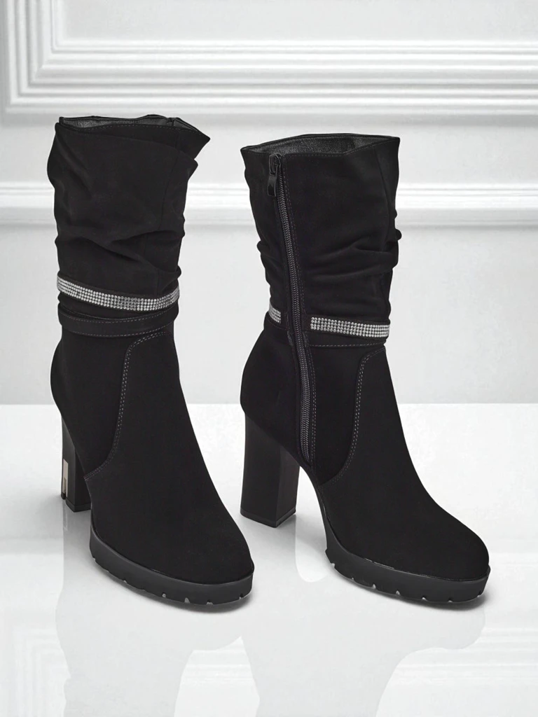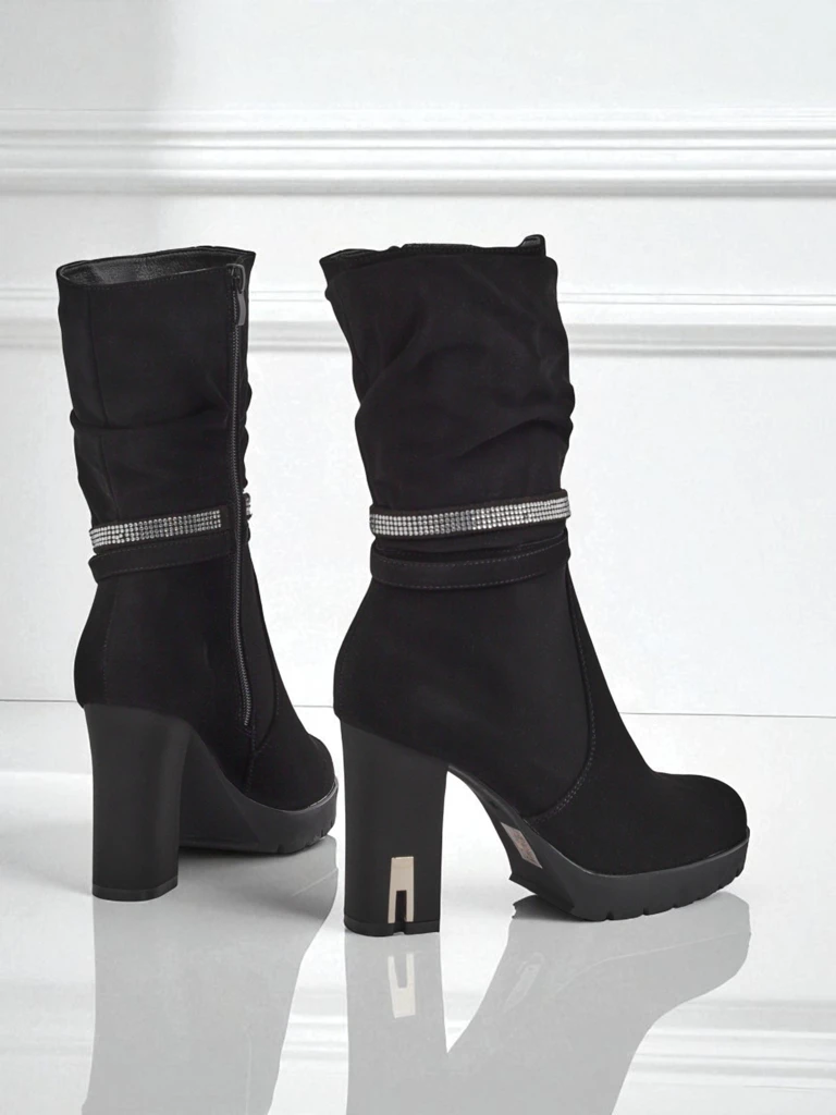 Les bottines noires Aurelia Roma combinent élégance moderne et confort, ce que toutes les amatrices de solutions élégantes apprécieront. Fabriquées en cuir écologique suédé de haute qualité, elles se caractérisent par la douceur et la durabilité du matériau, ainsi que par la facilité d'entretien. Le matériau extérieur est respirant, agréable au toucher et garantit un confort durable, tandis que l'intérieur est fini avec une doublure délicate assurant la chaleur même par temps froid. Le modèle possède une semelle solide en plastique assurant la stabilité et une adhérence adéquate sur différentes surfaces. Les bottines se ferment avec une fermeture éclair pratique pour faciliter l'enfilage et le retrait. L'accent unique de ce modèle est une bande décorative avec des cristaux brillants autour de la tige, qui donne à l'ensemble un caractère raffiné et s'inscrit parfaitement dans les tendances actuelles des accessoires brillants. Un talon bloc efficace et stable avec un détail métallique garantit le confort d'utilisation et souligne la silhouette, tout en assurant la confiance à chaque pas. Les bottines Aurelia Roma sont parfaites pour le quotidien comme pour les occasions spéciales – voici trois propositions de combinaisons de mode : 1. Style décontracté : associez-les à un pantalon skinny noir, un pull ample et un manteau couleur camel pour un look urbain confortable, idéal pour le travail ou une rencontre entre amis. 2. Style de soirée : associez les bottines à une jupe midi en tulle et un chemisier ajusté avec de délicates décorations – grâce aux cristaux sur les chaussures, vous créerez une tenue de soirée phénoménale. 3. Style rétro : portez-les avec une robe évasée de style années 70 et un perfecto en cuir pour donner à l'ensemble un caractère moderne avec une touche de nostalgie. Pour assurer la longévité des bottines, il est recommandé d'utiliser des produits spécialisés pour l'entretien du daim synthétique et de brosser régulièrement la tige. Après le port, il est conseillé de remplir les chaussures de papier pour qu'elles ne perdent pas leur forme et de les sécher loin des sources de chaleur. Évitez le contact avec l'eau et la boue – éliminez toute saleté avec une brosse douce. Le détail métallique sur le talon doit être essuyé avec un chiffon sec pour conserver son éclat. Les bottines à talons sont présentes sur les podiums depuis plusieurs saisons, étant un élément indispensable d'une garde-robe capsule. Aurelia Roma est une réponse aux tendances actuelles – une combinaison de minimalisme et de décorations spectaculaires qui ajouteront de la confiance et souligneront le style individuel de chaque femme.