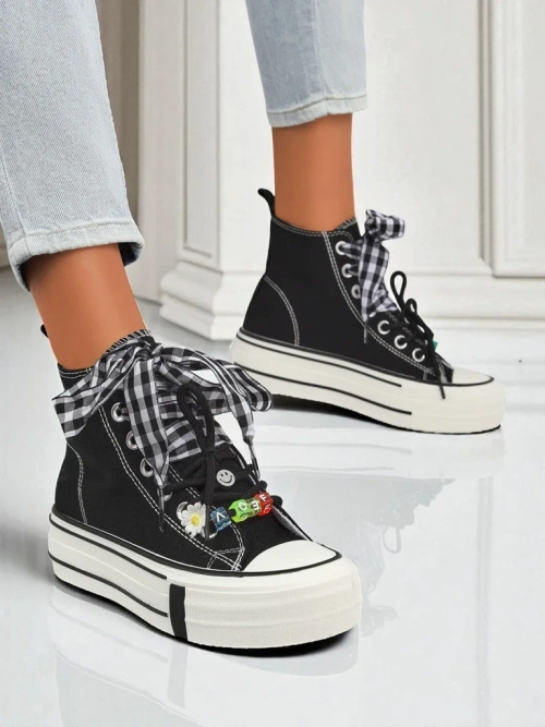 - Baskets tendance en tissu sur une semelle épaisse. Ornées de lacets colorés et de perles. Confortables, légères et élégantes – parfaites pour les looks urbains et le port quotidien. Confort et tendance en une seule étape.