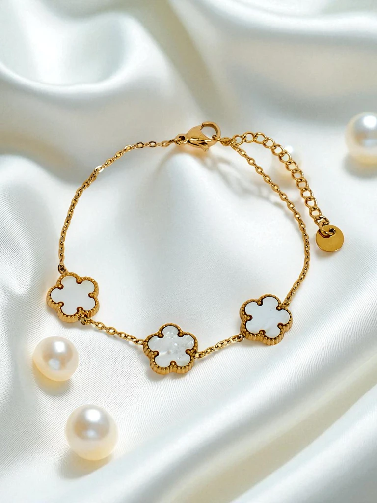 Bracelet Aurelia Bianca avec des fleurs dans une nuance de perle blanche, plaqué or.