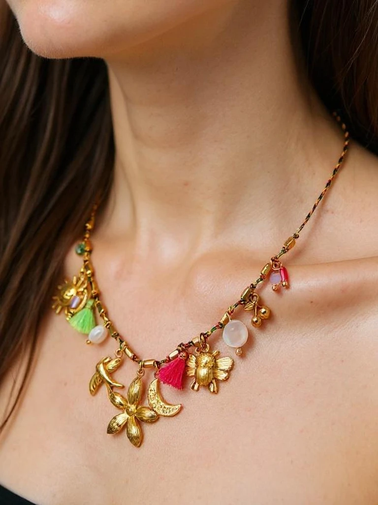 • Le collier Aurora Floralis avec des breloques et des perles est un bijou unique de style bohème, parfait pour toutes les occasions.