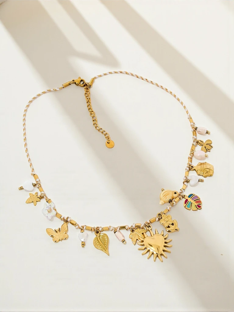 Découvrez le collier unique Aurelia Charis, qui se distingue par sa richesse de détails et sa fabrication soignée. Ce modèle est fabriqué à partir d'un alliage de métaux précieux de haute qualité, recouvert d'un revêtement galvanique durable et hypoallergénique de couleur dorée, qui assure un bel éclat et une résistance à l'abrasion. Les éléments décoratifs sont de petits pendentifs à motifs botaniques et symboliques : feuilles, papillons, soleil, cœur ou monstera colorés, chacun étant façonné avec précision, partiellement recouvert d'émail et orné de perles de verre et de perles synthétiques. Ce collier est léger, confortable et doux pour la peau, il ne contient ni nickel ni substances sensibilisantes, ce qui est confirmé par les certificats de qualité appropriés. Les avantages exceptionnels du produit sont l'originalité du motif, la possibilité de réglage de la longueur et la polyvalence grâce à la combinaison de l'or et des détails colorés. Il est parfait pour un usage quotidien et pour les stylisations de soirée. Comment porter Aurelia Charis ? 1. Associez-le à une chemise en lin blanc et à un jean mom-fit pour ajouter de la fraîcheur à votre style. 2. Combinez-le avec une robe maxi bohème vaporeuse et des sandales compensées – un look idéal pour les festivals d'été. 3. Portez le collier avec une combinaison élégante ou des robes noires simples pour ajouter une touche d'extravagance artistique. Pour profiter longtemps de l'éclat du collier, rangez-le dans un sachet ou une boîte séparée, en évitant le contact avec l'eau, les parfums et les détergents. Nettoyez délicatement avec un chiffon doux. En cas de poussière ou de saleté, il suffit d'essuyer avec un chiffon légèrement humide et de laisser sécher. La mode bohème est de nouveau à l'honneur sur les podiums du monde entier, et les bijoux avec des pendentifs spectaculaires sont un must absolu. Le collier Aurelia Charis s'inscrit parfaitement dans ces tendances, en combinant des motifs naturels avec une forme expressive. C'est un excellent choix pour les personnes qui apprécient l'originalité et le style décontracté.