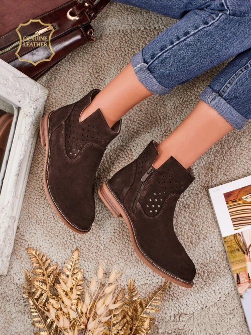 - Bottines à semelle plate - style et confort en un seul produit. La découpe à la cheville et la fermeture éclair facilitent l'enfilage. L'ensemble est fabriqué en cuir suédé naturel et en cuir naturel à l'intérieur. Ce modèle vous donnera de l'assurance !