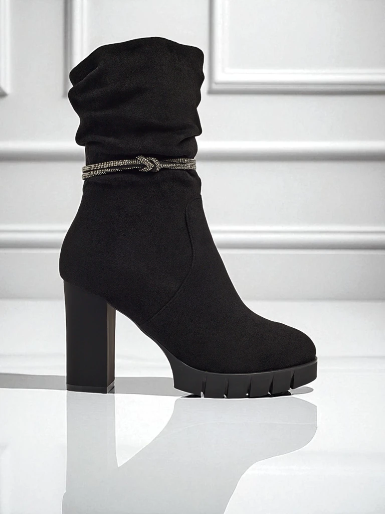 - Bottines confortables à talons épais, fabriquées en cuir écologique suédé. Modèle fermé par une fermeture éclair. Possède une bride décorative avec des zircons. Doublure en fourrure délicate.