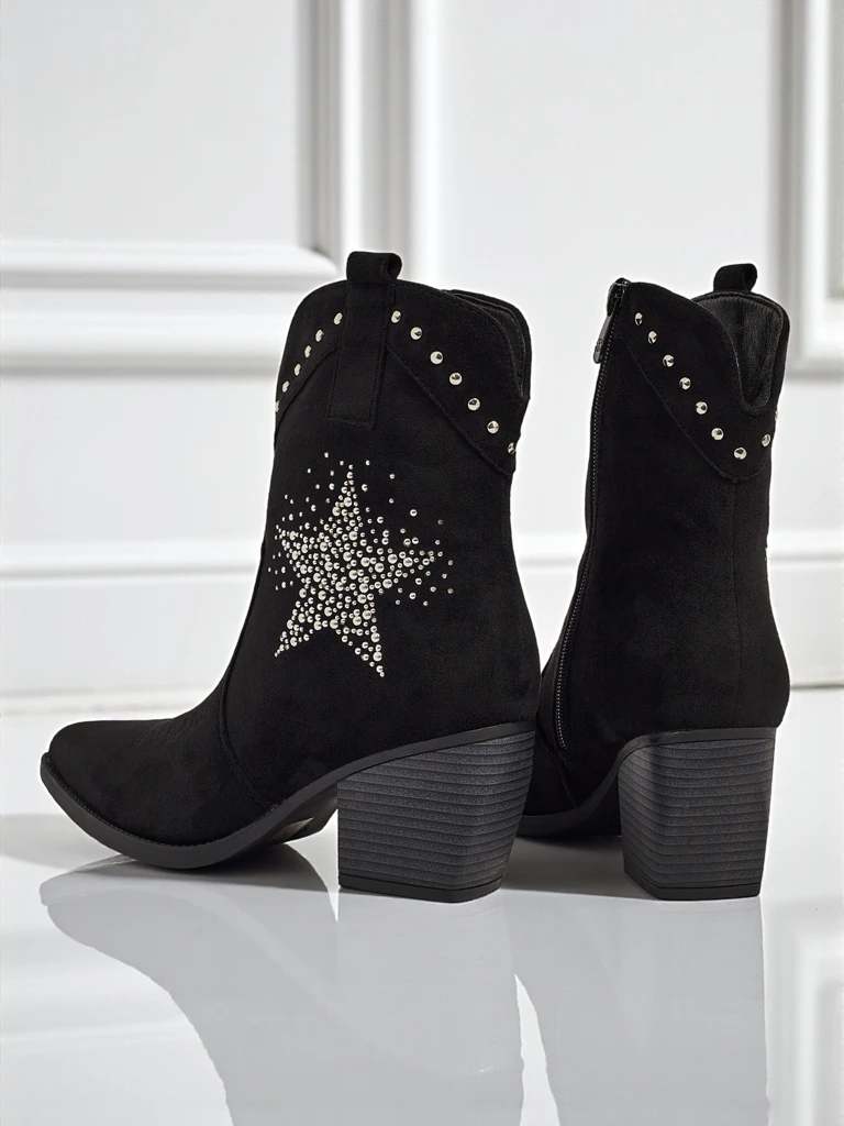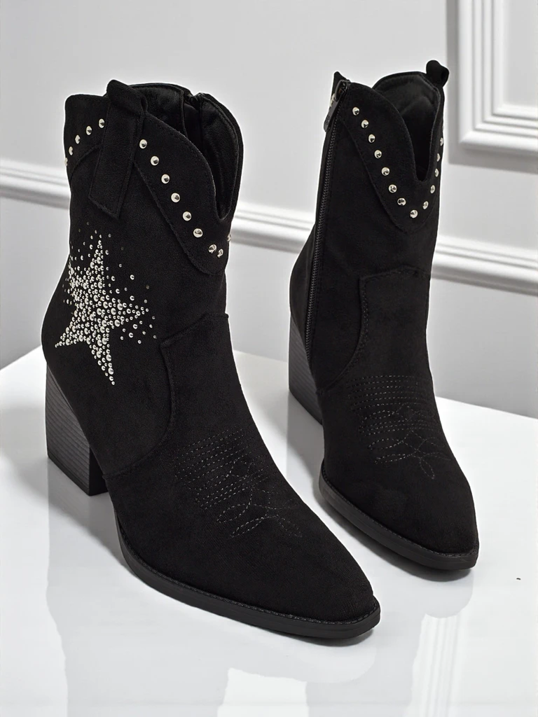 - Bottines style cow-boy à talon, fabriquées en cuir écologique suédé. Semelle intérieure en tissu, les chaussures se ferment avec une fermeture éclair ornée d'une étoile décorative en strass. Elles s'accordent avec de nombreux styles féminins !