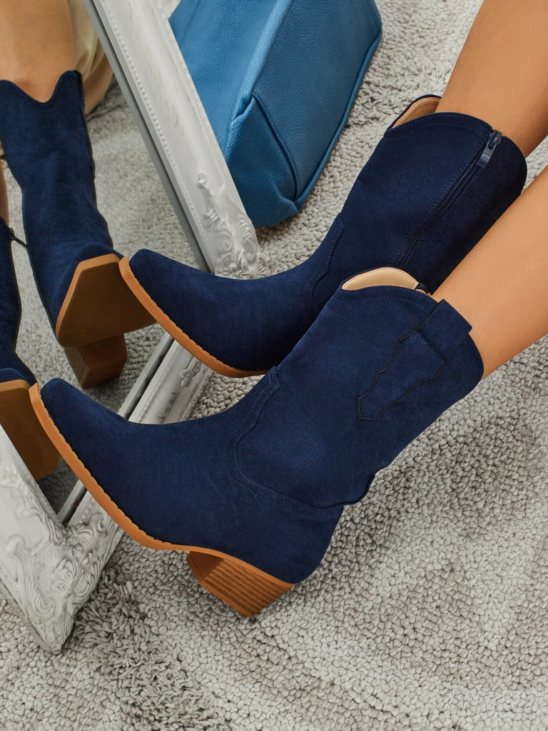 - Bottines style cow-boy à talon plat, fabriquées en cuir écologique suédé. Semelle intérieure en tissu, fermeture éclair. Elles s'accordent avec de nombreux styles féminins !