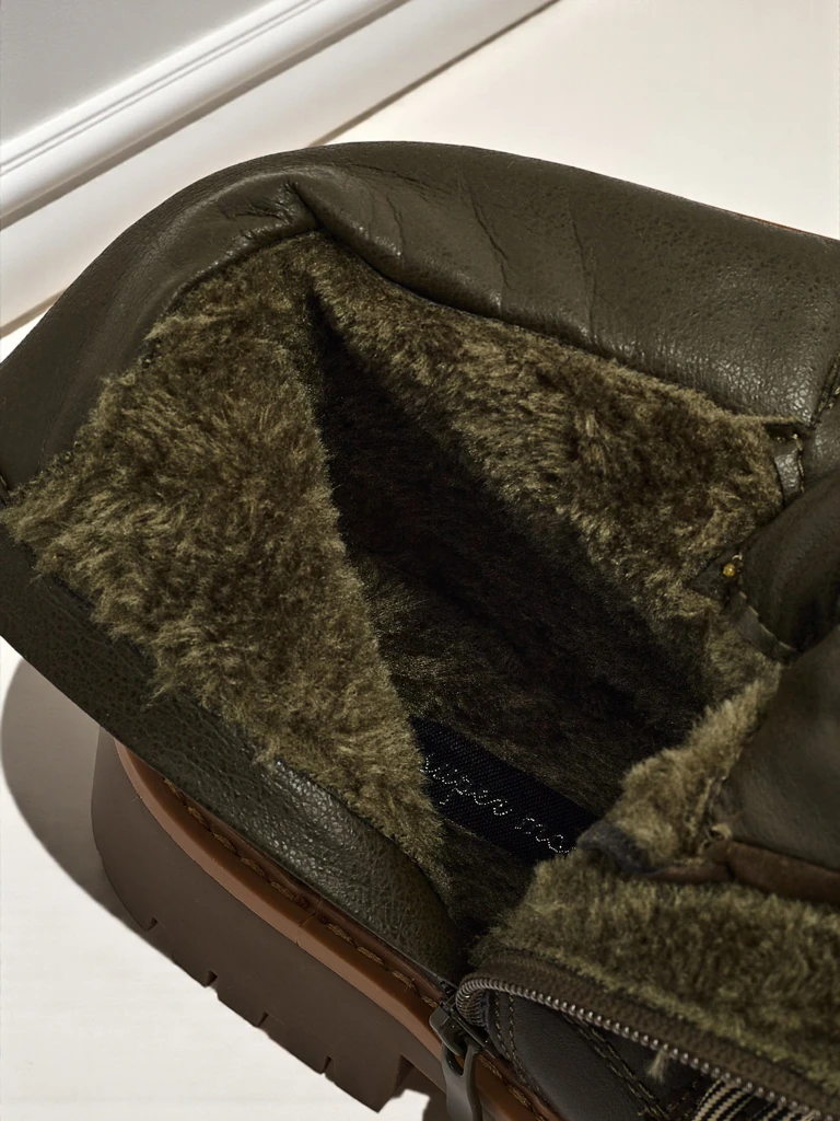 • Bottines de randonnée pour femmes avec tige lacée et fermeture éclair sur le côté. Le matériau est en cuir écologique. L'intérieur des chaussures est isolé avec de la fourrure. Parfaites pour l'hiver !