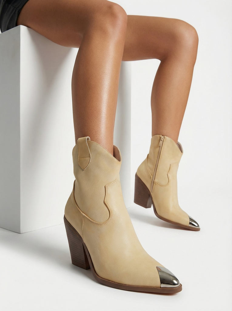 - Bottines style cow-boy à talon, fabriquées en cuir écologique. Semelle intérieure en tissu, fermeture éclair et bout pointu décoratif. Elles s'accordent avec de nombreuses tenues féminines !