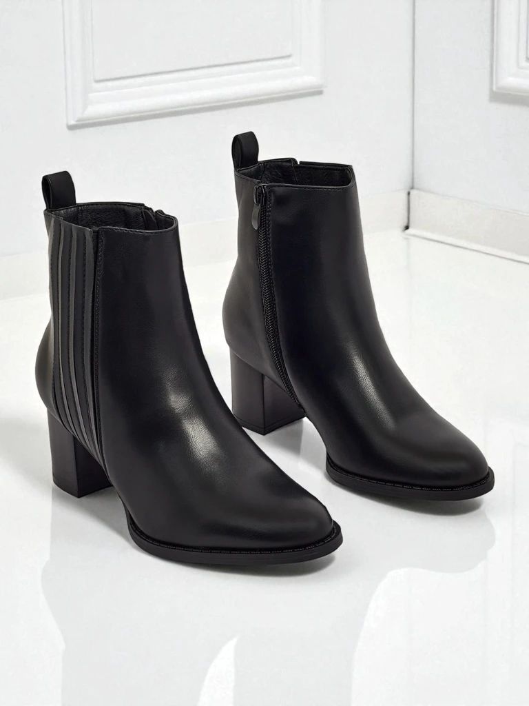 - Bottines confortables à talon bloc, fabriquées en cuir écologique. Modèle fermé par une fermeture éclair, avec une isolation sous forme de fourrure délicate. Le choix idéal pour l'automne !