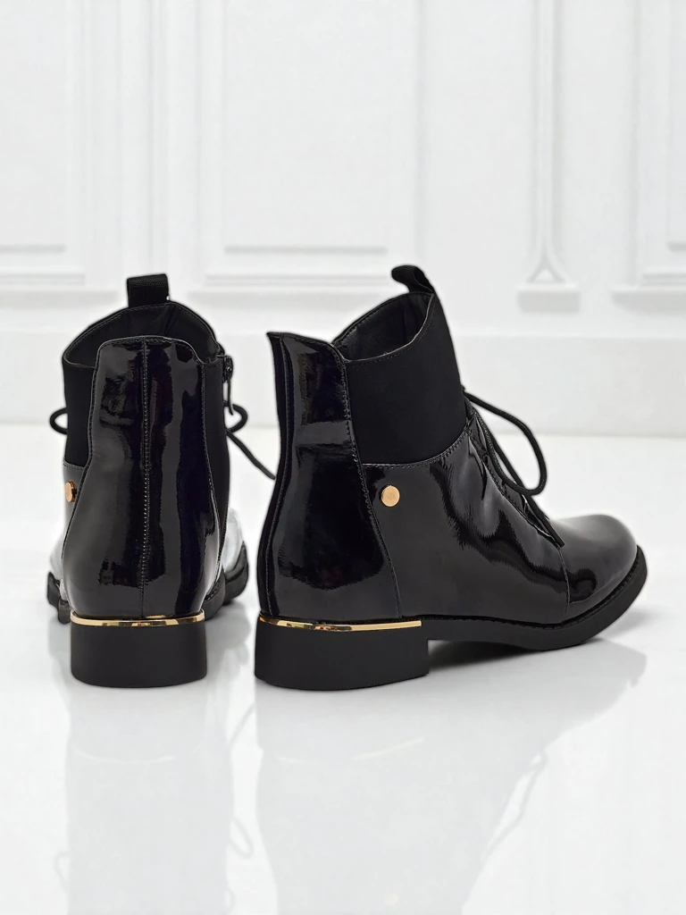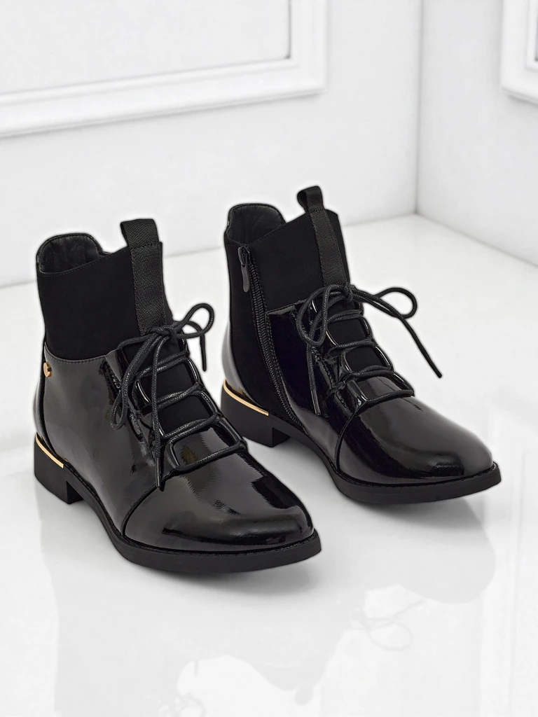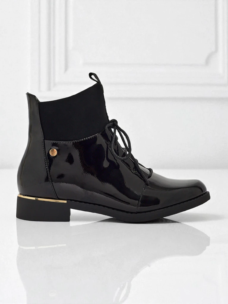 - Bottines pour femmes en cuir écologique verni, avec fermeture éclair et lacets et bout rond - isolation supplémentaire sous forme de fourrure - modernité, confort et style en un.