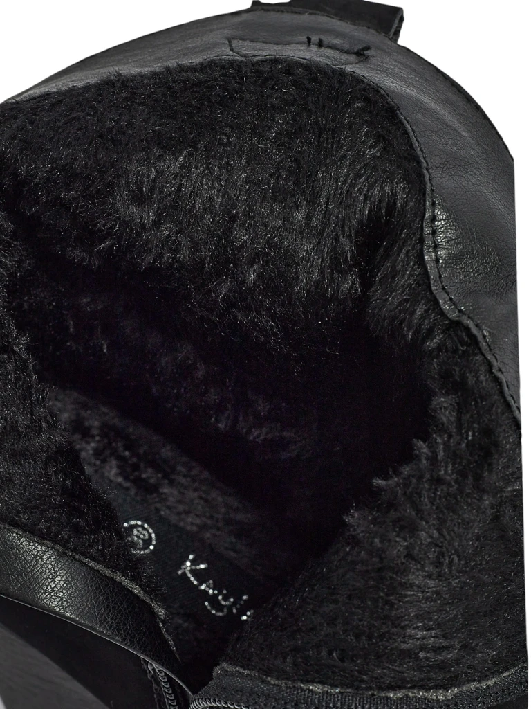 - Bottines style cow-boy à talon, en cuir écologique mat. L'intérieur est doublé de fourrure, les bottes se ferment avec une fermeture éclair et des inserts décoratifs à paillettes. Elles s'accordent avec de nombreux styles féminins !