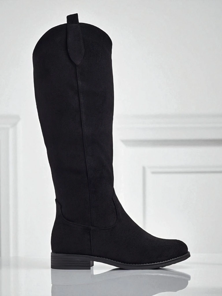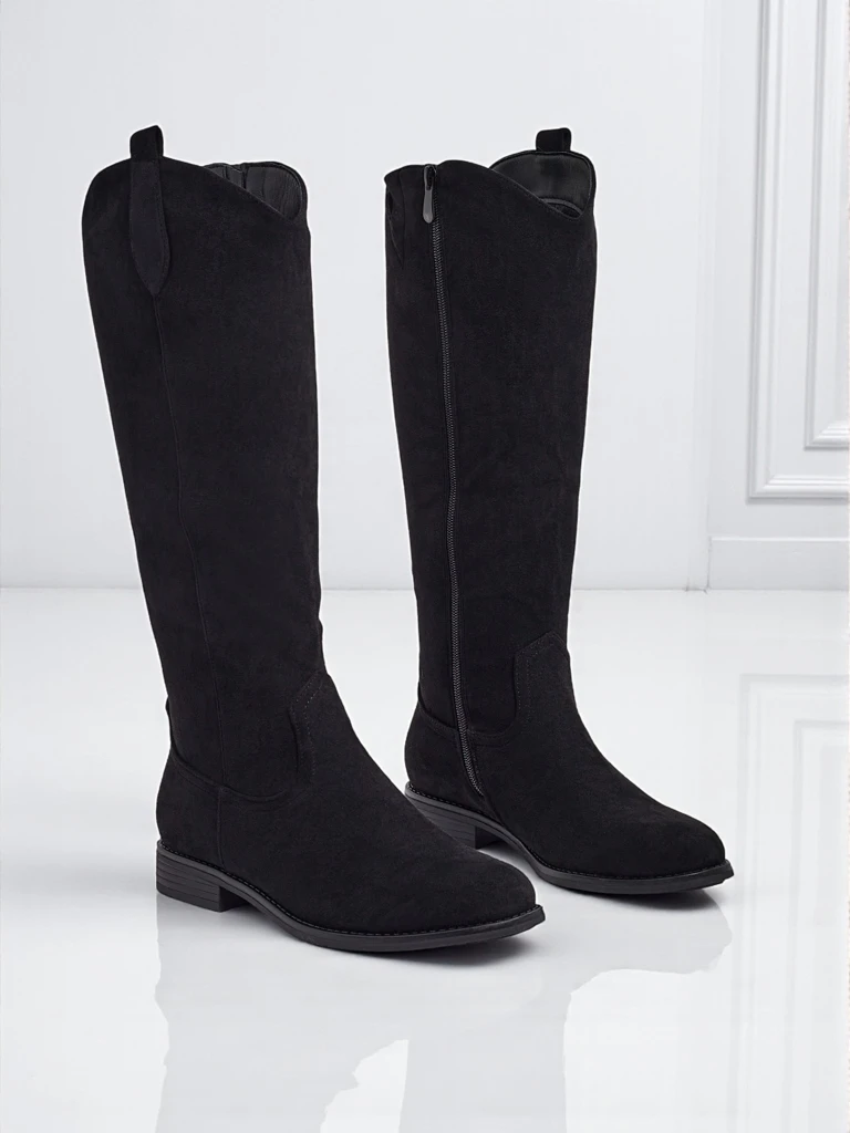 - Élégantes bottes hautes pour femmes à semelle plate. La tige est en cuir écologique suédé, l'intérieur est isolé avec de la fourrure. Modèle fermé par une fermeture éclair. Parfaites pour les tenues d'automne de tous les jours !