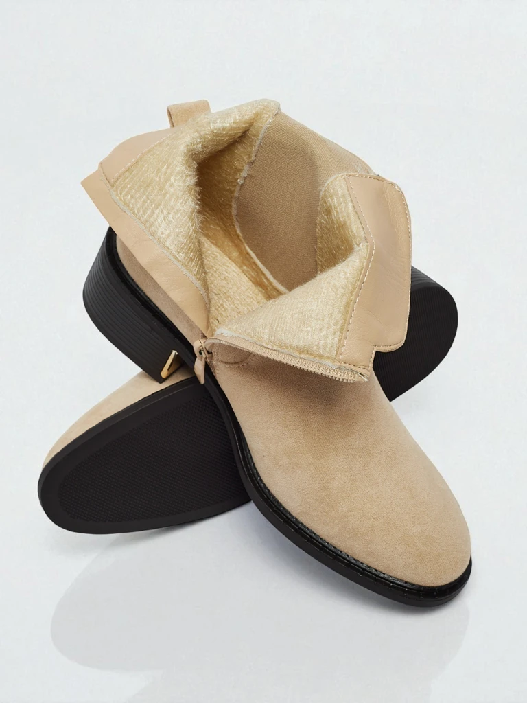 - Bottines pour femmes avec fermeture éclair. Modèle en cuir écologique, à semelle plate. Doublure intérieure imitation fourrure. Ornées de boucles dorées. Confortables et élégantes, parfaites pour l'automne !