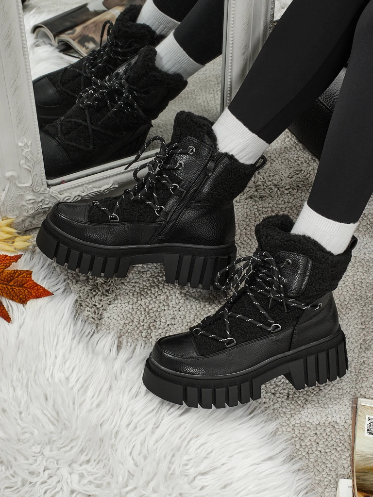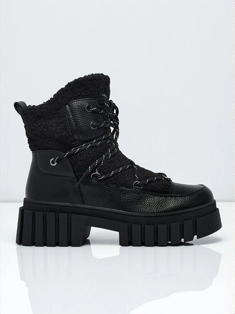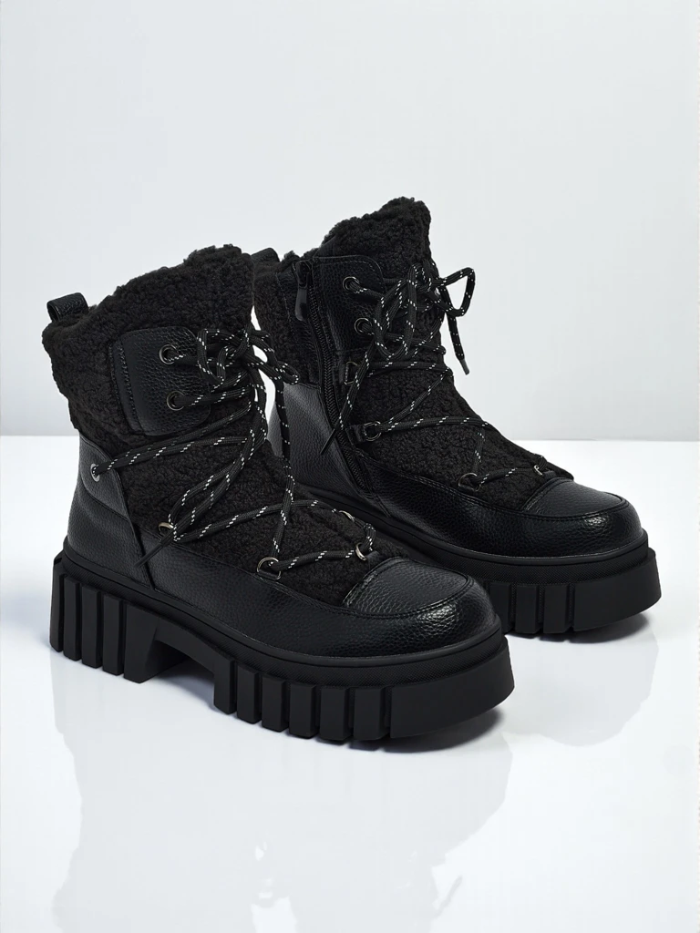 - Bottines workwear montantes pour femmes en cuir écologique, à lacets et fermeture éclair. Modèle à semelle plate, avec une isolation délicate sous forme de fourrure. Un choix idéal pour les temps plus froids !