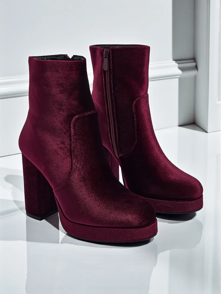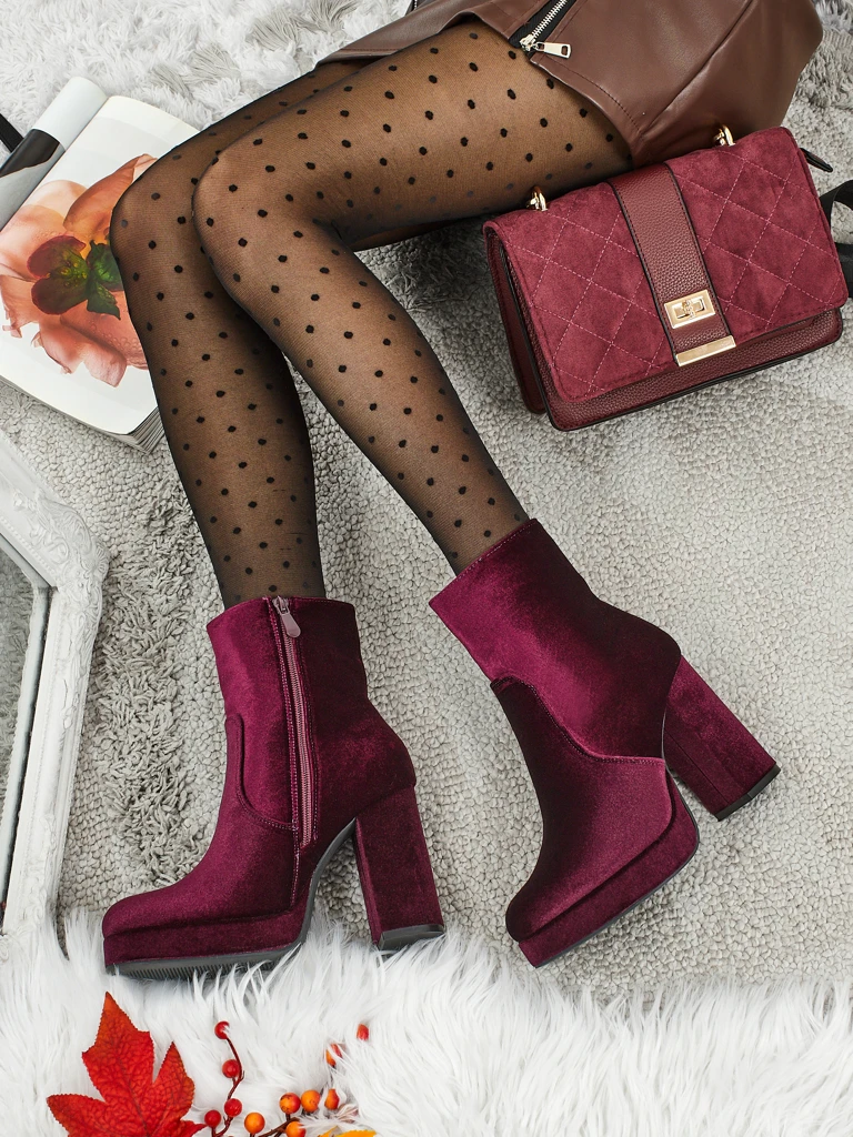 - Bottines confortables à talons épais, en tissu imitation velours. Modèle fermé par une fermeture éclair. Possède une isolation délicate sous forme de fourrure. Un choix idéal pour l'automne !